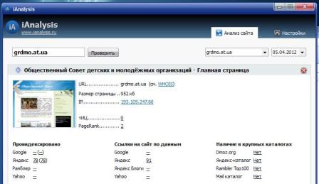 i Analysis - бесплатная и простая в использовании программа, которая позволяет осуществить мониторинг сайта в поисковых системах Google, Yandex, Rambler, Yahoo, а так же отображает тематический индекс цитирования (тИЦ) и PageRank.